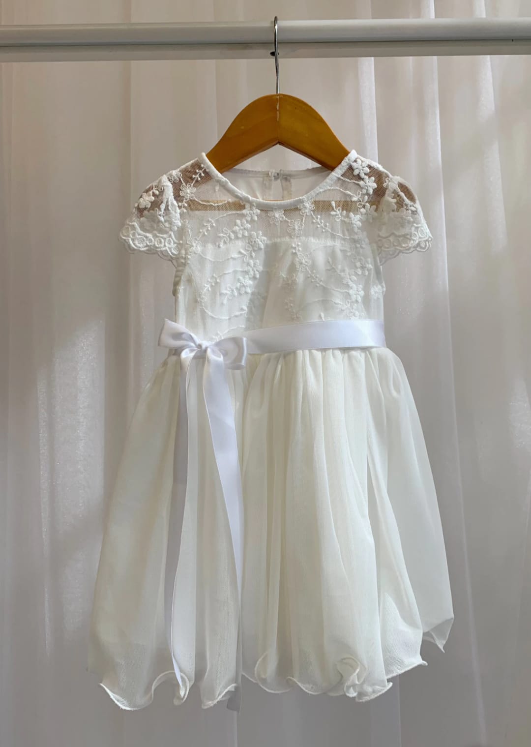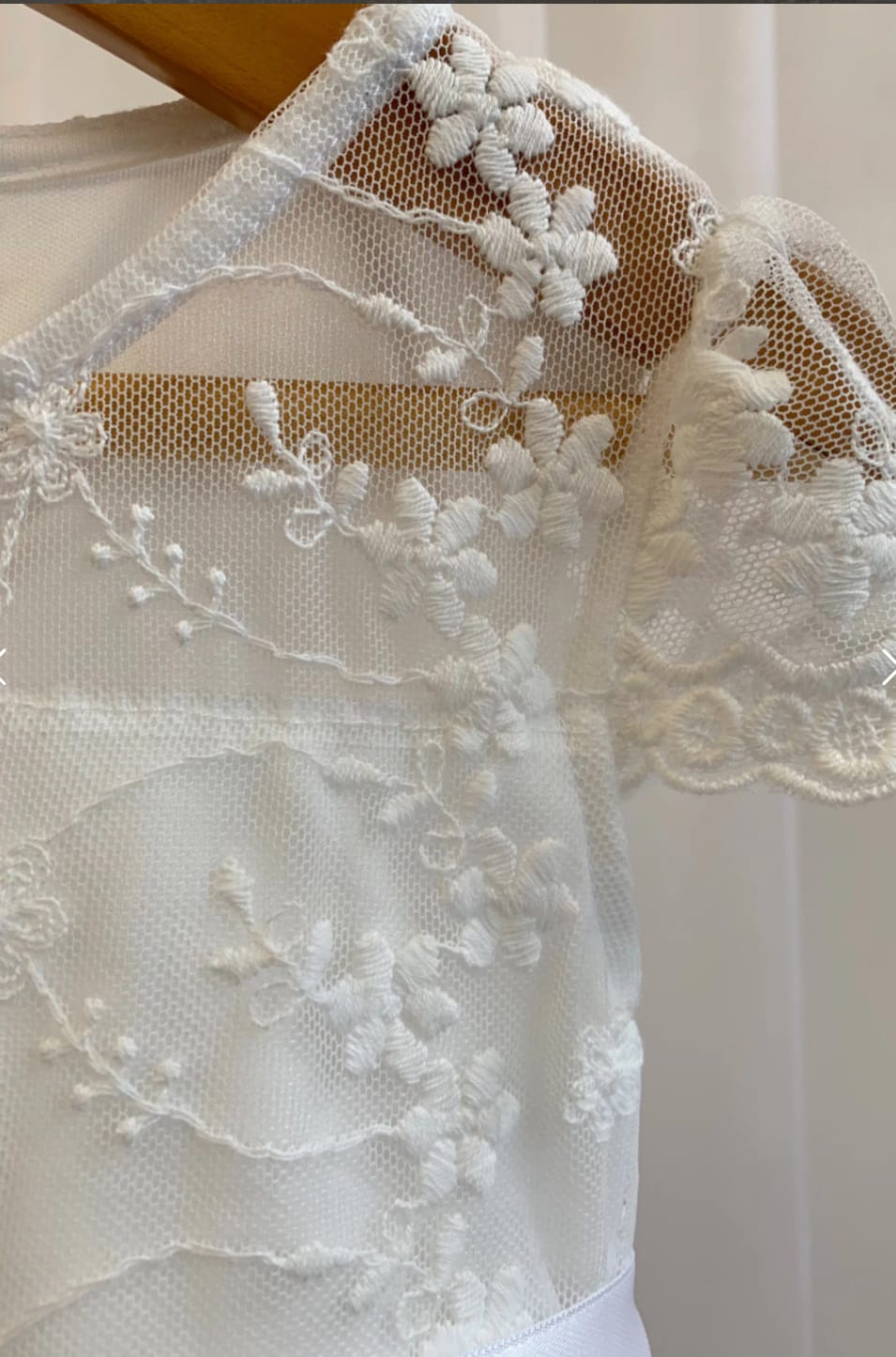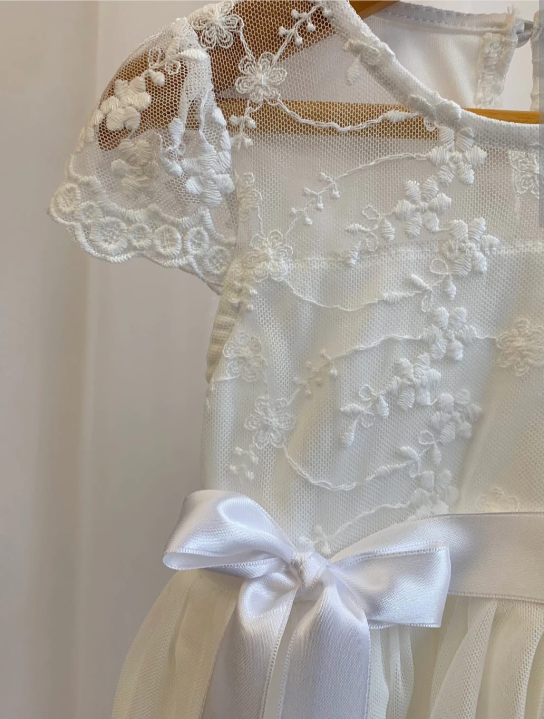 Vestido de bautismo para niña en tono blanco con delicado encaje floral, mangas cortas y falda suave con cinta de raso en la cintura. Un diseño elegante y angelical para ceremonias especiales. Talle 18 a 24 meses.