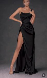 Vestido largo negro de un solo hombro con abertura en la pierna. Elegante, moderno y sensual, ideal para eventos de gala.