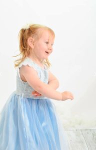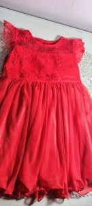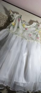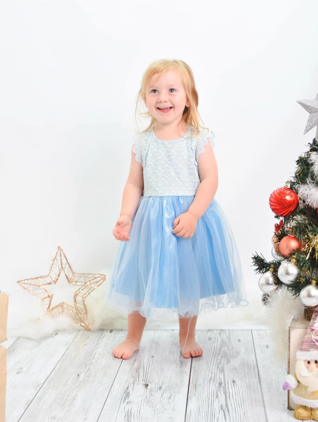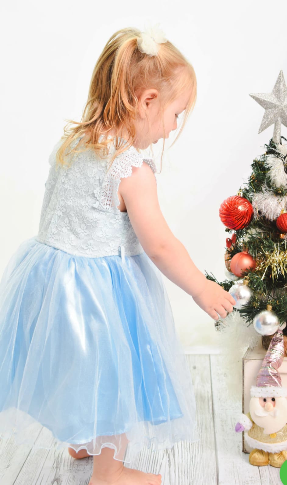 Vestido infantil en tono celeste con parte superior de encaje floral y falda amplia de tul vaporoso. Un diseño delicado y romántico ideal para ocasiones especiales. Talle 18 a 24 meses.