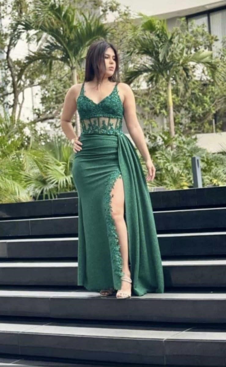 Vestido largo verde esmeralda en lurex con encaje y abertura en la pierna. Un diseño elegante y sofisticado ideal para eventos y galas.