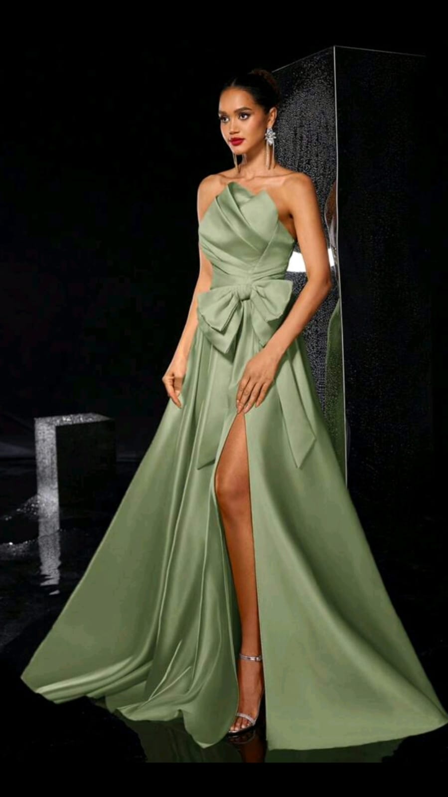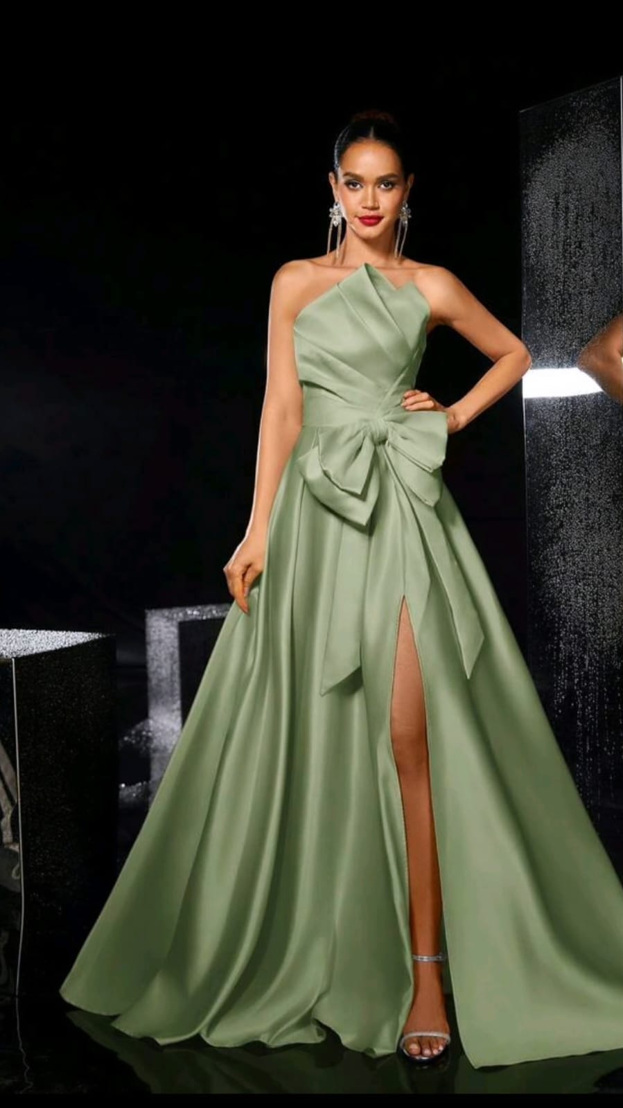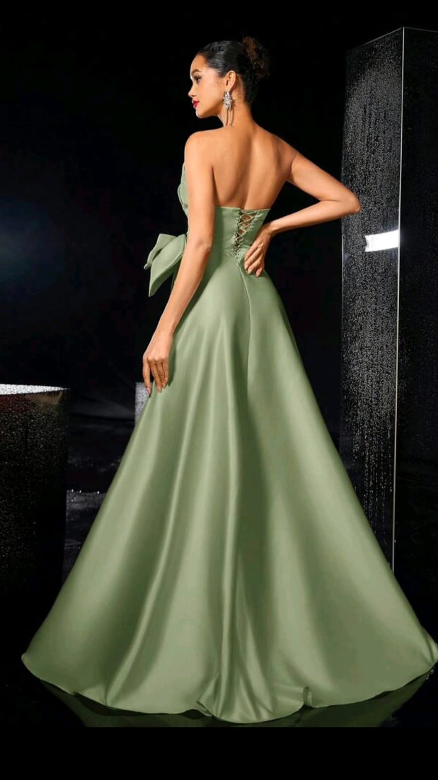 Confeccionado en tela satinada de acabado suave, en un elegante tono verde oliva, este vestido es ideal para fiestas de gala, bodas, eventos formales o celebraciones especiales donde quieras brillar con sofisticación.