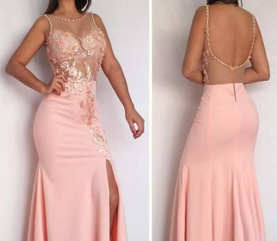 Vestido largo rosa pastel con tul bordado y abertura lateral. Delicado, elegante y femenino. Talles S-M..